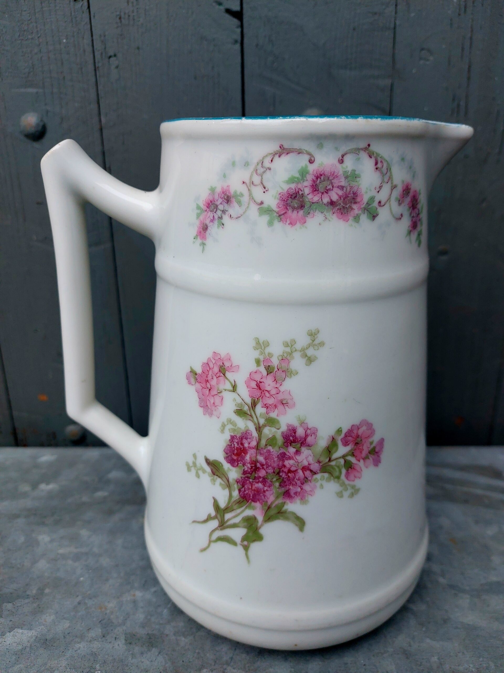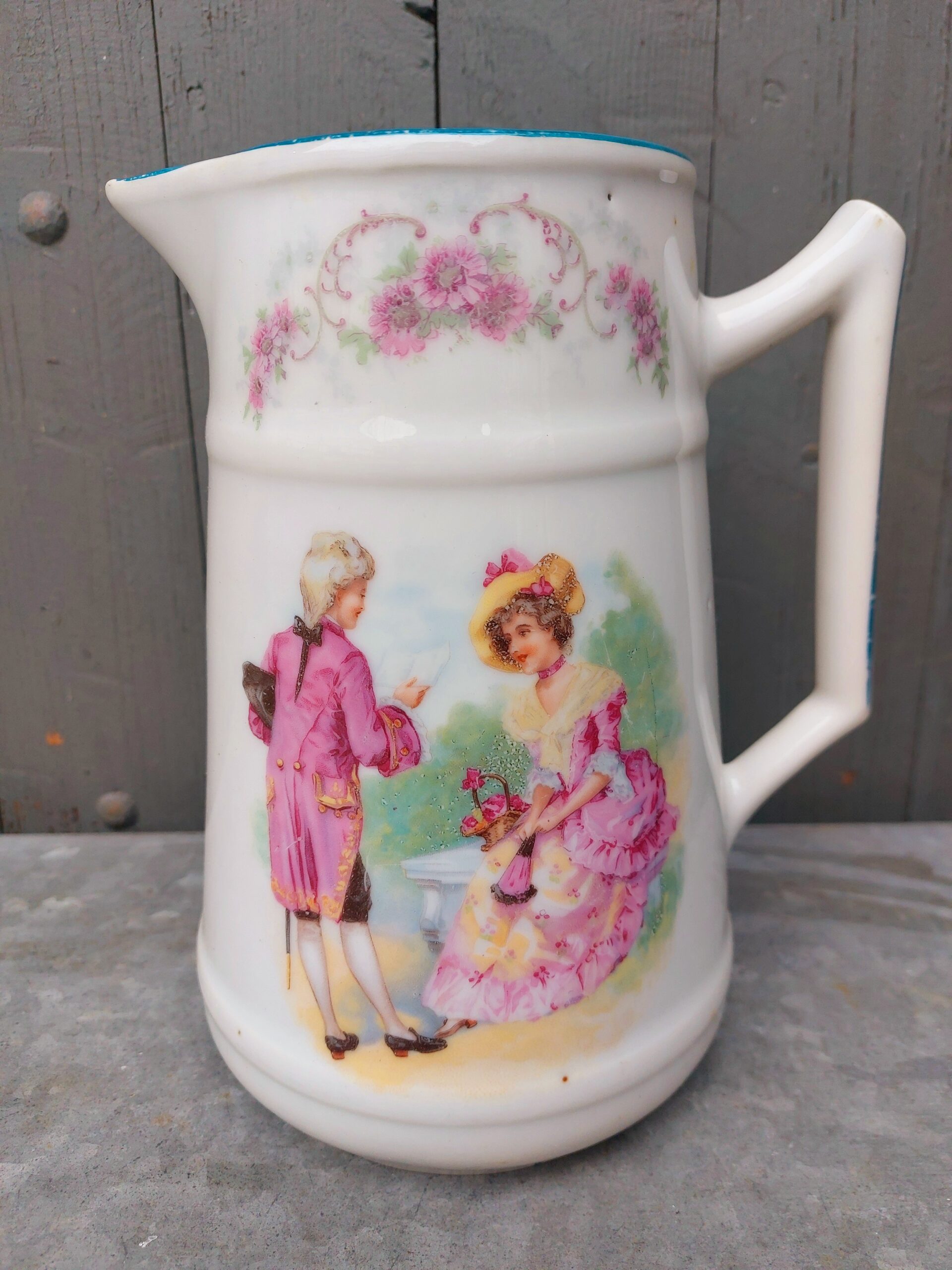 Brocante schenkkan van porselein met fraaie afbeelding , hoogte van deze kan is ca. 23 cm.