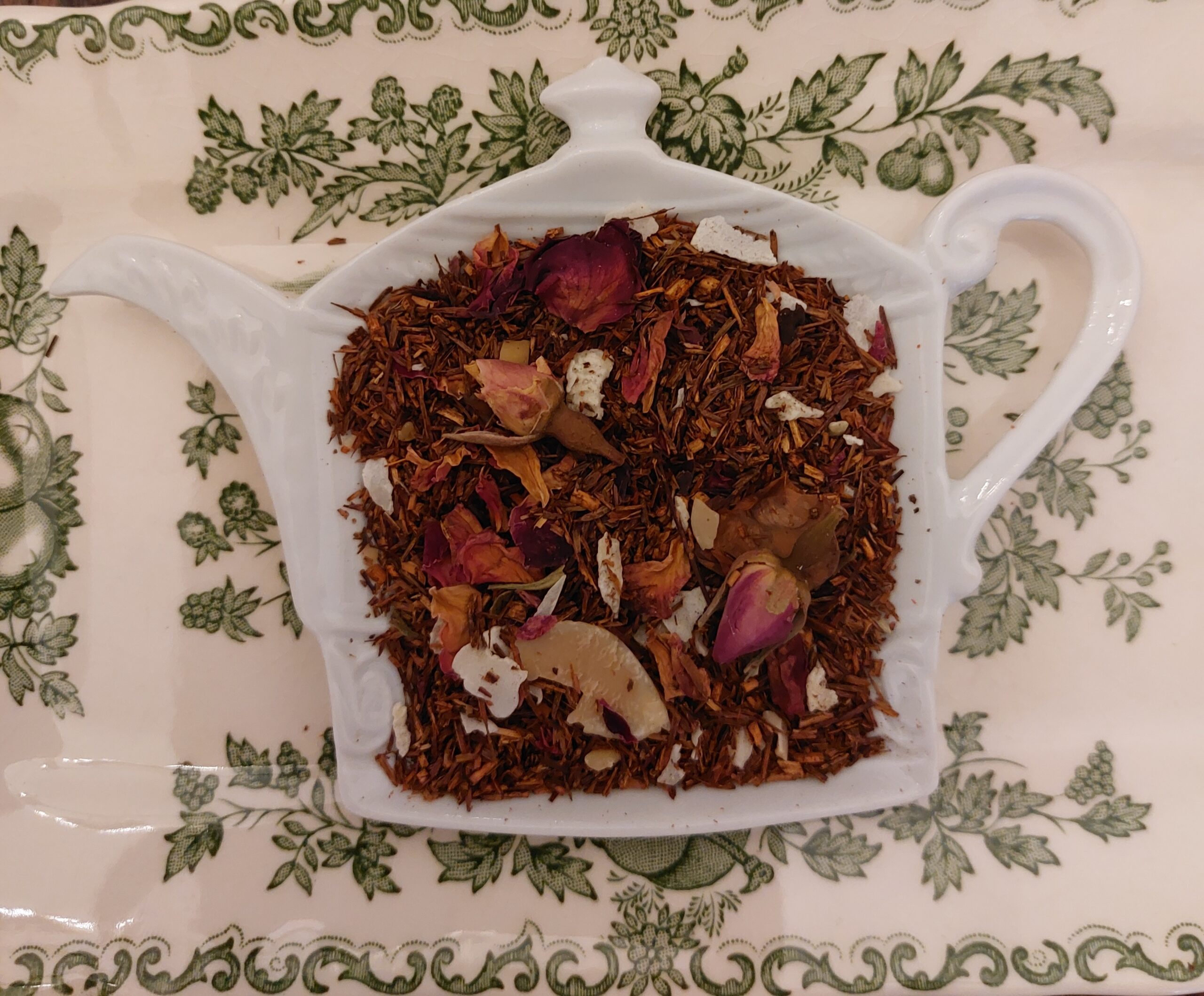 Ingrediënten: Rooibos, amandelen, rozenknopjes, kokos stukjes, rozenblaadjes.